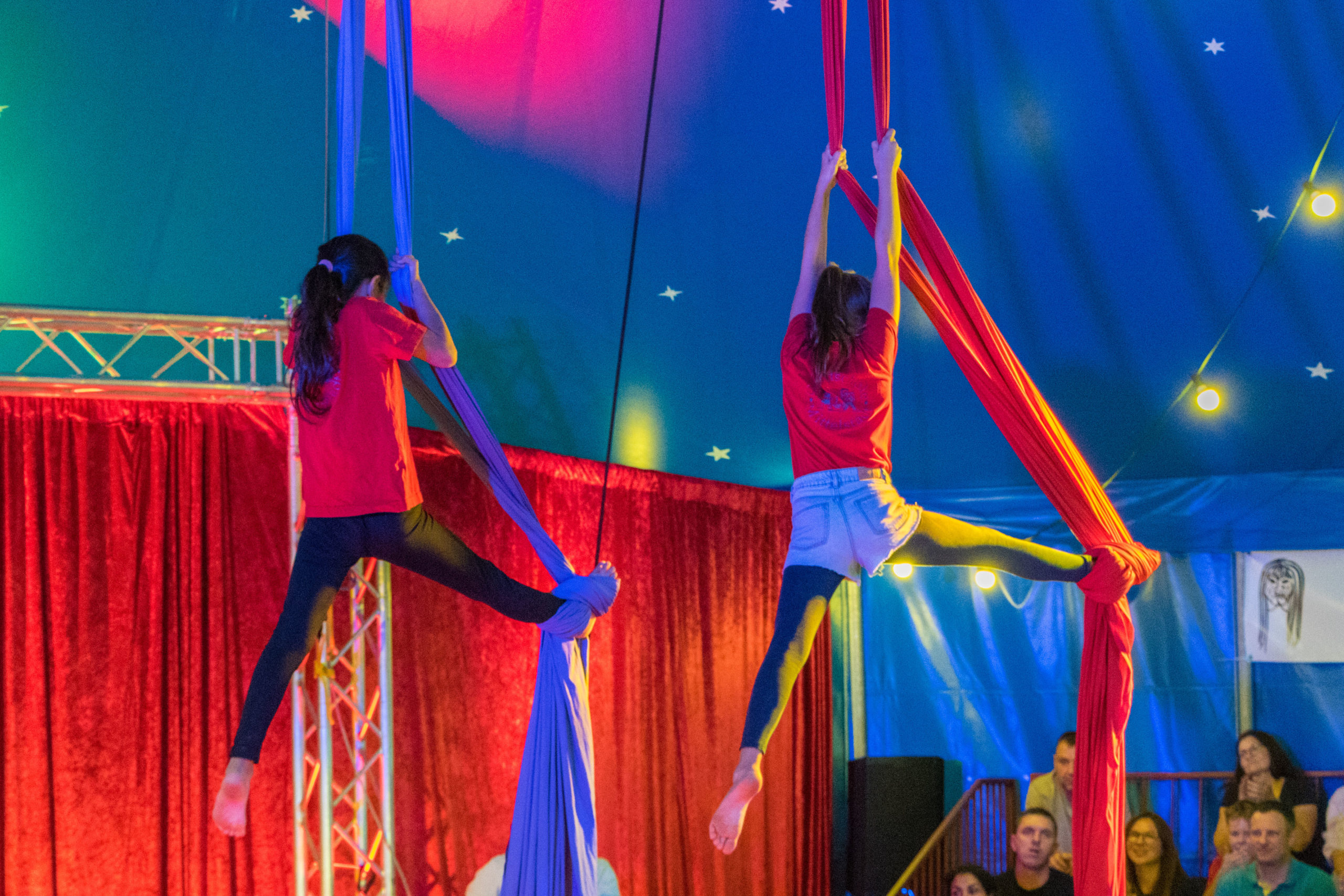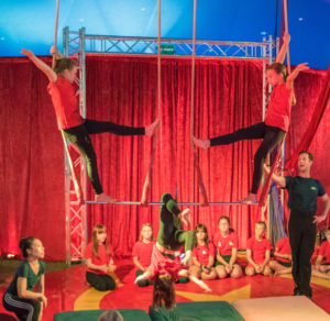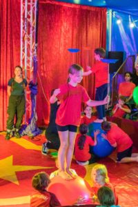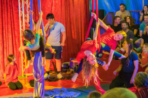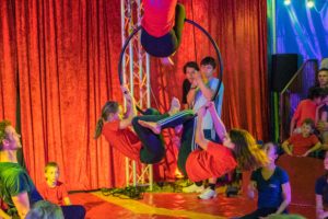 Am Freitag gab es dann am Nachmittag zwei große Aufführungen, an denen die Familien und Freunde bei der Abschlussgala ihre Kinder bestaunen und beklatschen durften. Bei der abwechslungsreichen und bunten Show versetzten die kleinen Artisten ihr Publikum mit überraschenden Luftakrobatiken, ebenso wie mit quirligen Darbietungen am Boden in Staunen. Und als große Überraschungsnummer fehlte auch ein Clown nicht, der stets Party machen wollte und damit den ruhebedürftigen Zirkusdirektor genüsslich auf die Palme und das Publikum zum Lachen brachte. Natürlich wurden die jungen Künstlerinnen und Künstler von ihrem Publikum begeistert gefeiert und stolz und glücklich, marschierten sie am Ende ihrer Darbietung aus der Manege.