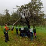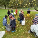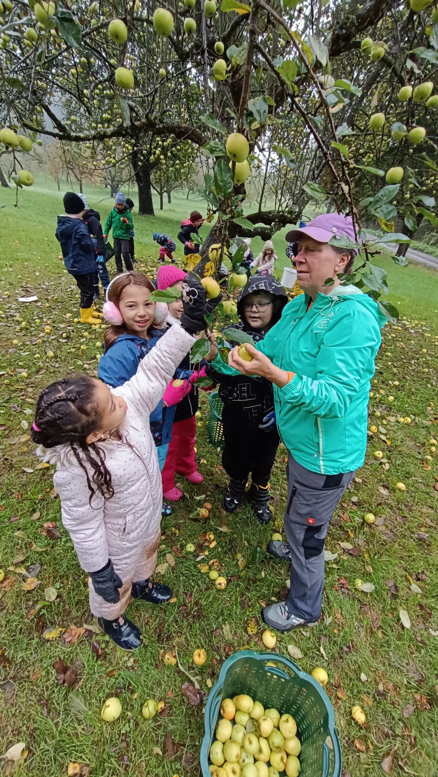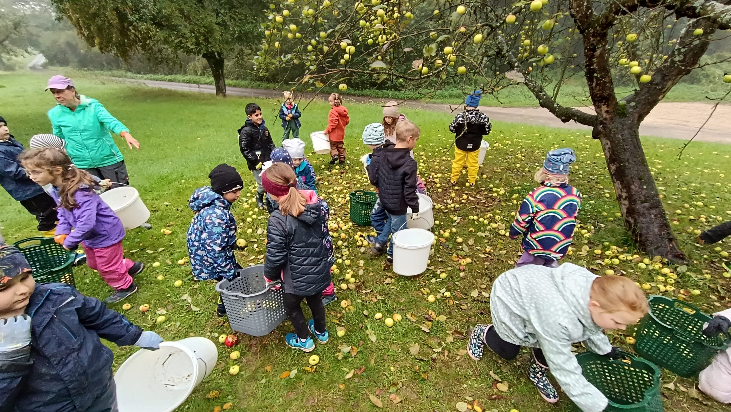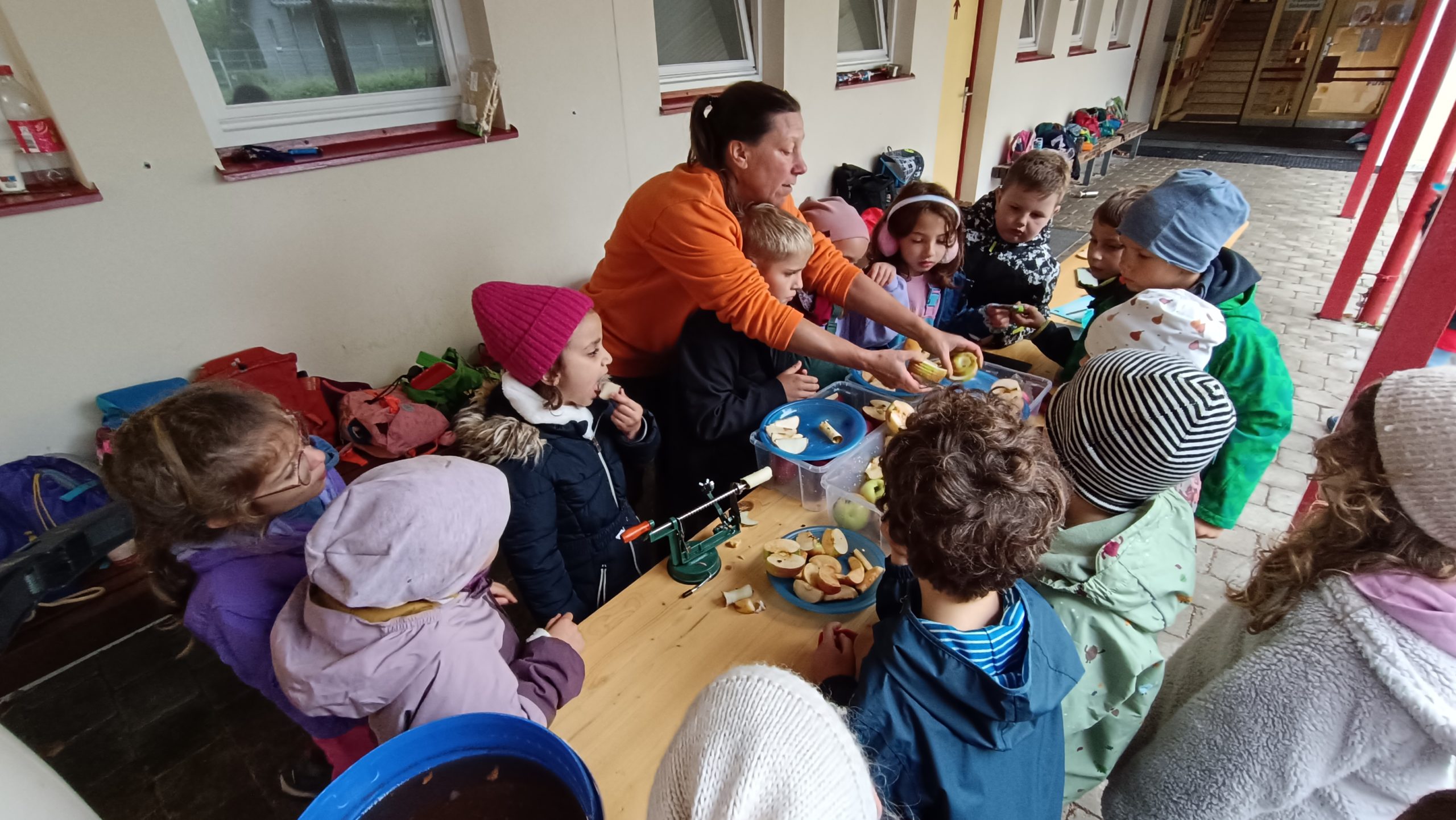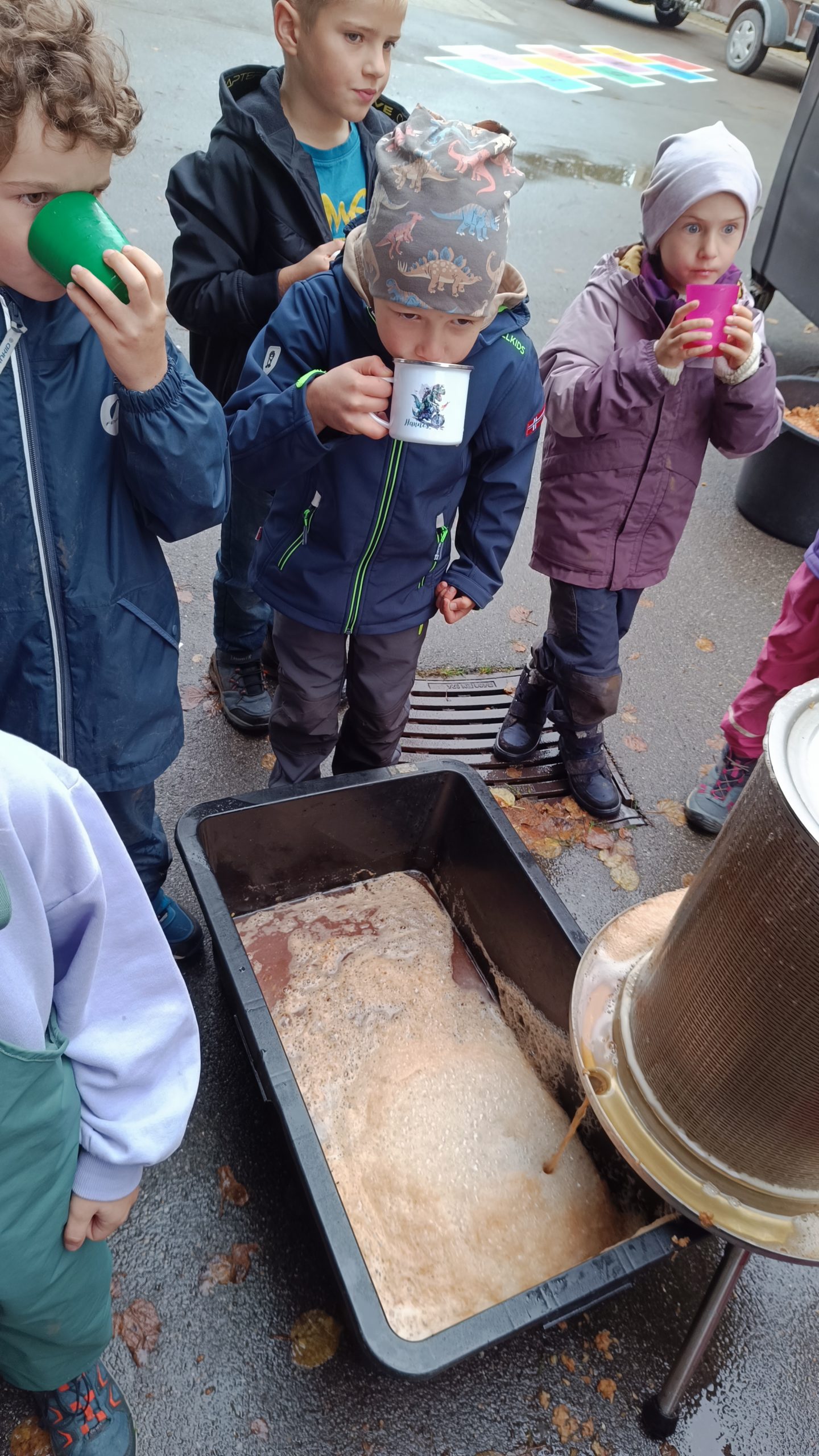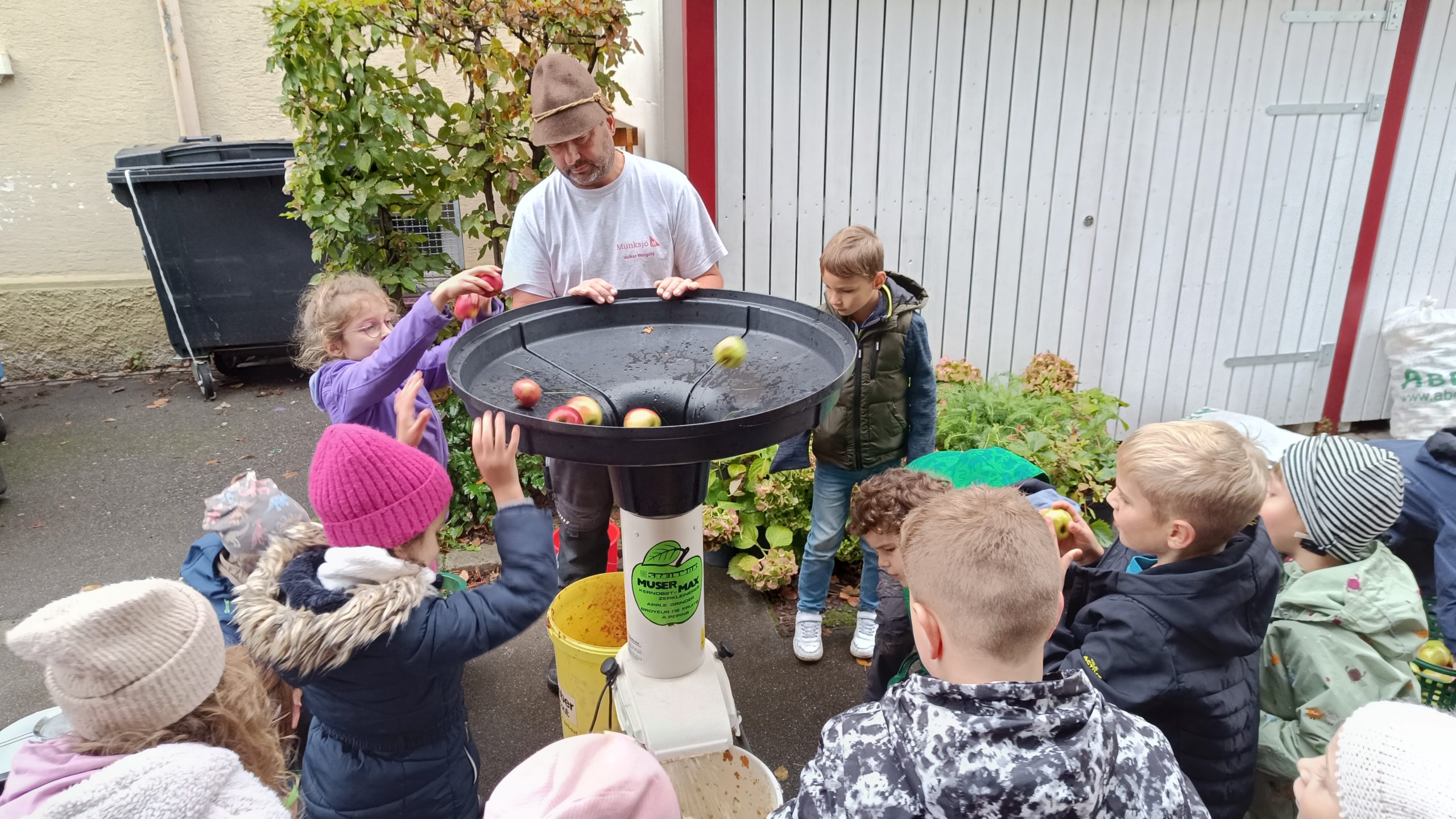 Am Freitag, den 26. September war es mal wieder soweit: der Obst- und Gartenbauverein Mittelstadt hat unter der Leitung von Cornelia Weigold und Bianca Oswald mit den Klassen 1a und 1b der Grundschule Mittelstadt einen Apfelsafttag veranstaltet. Gemeinsam ging es um 8 Uhr los zur Apfelbaumwiese; auf dem Weg dorthin waren alle begeistert von den Ziegen am Wegesrand. An der Wiese angekommen, erzählte Frau Oswald einiges rund um den Apfel und die verschiedenen Sorten, dann ging es auch schon los mit dem ersten Aufsammeln der Äpfel. Damit es noch mehr Äpfel zu sammeln gab, wurden die Äste kräftig geschüttelt, dabei durften die Kinder sich mit dem Eimer über dem Kopf unter den Baum stellen, das war ein großer Spaß für alle. Zurück an der Schule begann der zweite Teil der Aktion: Zunächst durften die Kinder der Klasse 1a von jeder Apfelsorte ein Stück probieren und Unterschiede herausschmecken, danach ging es ans Äpfel schneiden, damit sie später weiterverarbeitet werden konnten. Die Klasse 1b war in der Zwischenzeit mit „Äpfel waschen“ und diese anschließend „in die Häckselmaschine werfen“ beschäftigt. Dann wurden die gehäckselten Äpfel in einer Presse zu Apfelsaft bzw. Süßmost gepresst. Später tauschten die beiden Klassen ihre Aufgaben. In der großen Pause durften alle Kinder der Grundschule den leckeren Saft probieren. Die Kinder der ersten Klassen konnten nach der Selbstverkostung eine Flasche Saft zum Probieren mit nach Hause nehmen und waren total stolz, dass sie den Saft selbst gemacht haben.