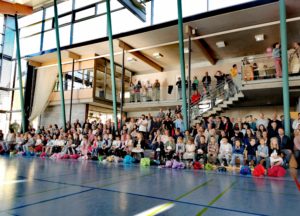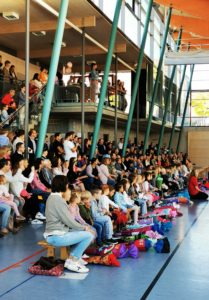 Seit 18. September sind wir endlich vollzählig: 35 Erstklässlerinnen und Erstklässler hatten an diesem wunderschönen Spätsommertag ihren ersten Schultag. Die beiden Pfarrer Alexander Schweizer und Thomas de Jong gestalteten den Einschulungsgottesdienst am Morgen mit viel Elan und segneten die Schulanfängerinnen und Schulanfänger und ihre Lehrerinnen. Die Kinder der dritten Klassen führten sie anschließend als Paten zur Turnhalle, wo die verbliebenen Kinder sie mit einem langen Spalier begrüßten.